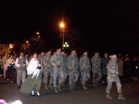 Auf jeden Fall trafen wir uns zu diesem Anlass mit Agrita und Kristin (zwei Mitarbeiterinnen aus der Ceribu Ligzda), da in der Innenstadt so einiges an Halligalli angesagt war. Im Endeffekt lief das ganze darauf hinaus, dass wir von Ort zu Ort, von Geschehnis zu Geschehnis, von Happening zu Happening liefen und meist nur das Ende mitkriegten. Was mir bei dem ganzen etwas seltsam vorkam war, dass es ständig um militärische Siegen ging. Dazu wurden Reden von Männern in Militäruniformen gehalten und Flaggen geschwungen, was mich irgentwie ein wenig an den Geschichtsunterricht zum Thema "Deutschland in den 30ern" erinnert hat, wenn auch nicht ganz so pompös. Vieleicht lag es auch daran, dass bei der Diashow, die im Hintergrund auf einem der Orte des Geschehens lief, neben Bildern von Bärenjägern und alten Volksarmeen auch hin und wieder mal ein Foto von einem stolz und stramm stehenden SS-Soldaten, ausgerechnet über die Außenwand des Okkupationsmuseums flackerte. Nu já...