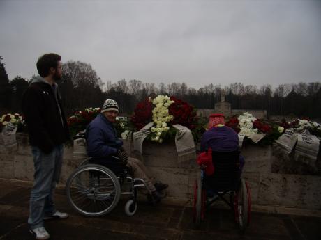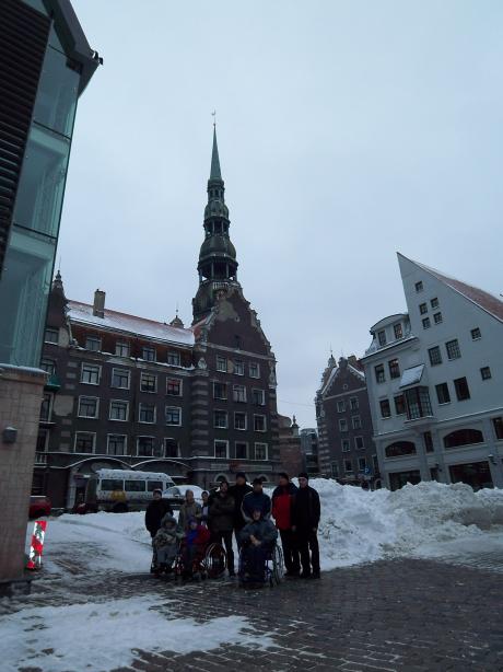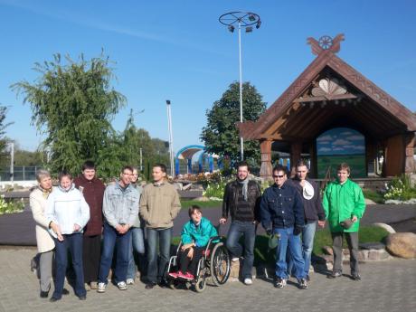 Dann, sobald er - von wo auch immer - wieder erscheint, werden die Türen geöffnet und alle steigen aus. Dann dauert es nicht lange bis die erste Fotokulisse ausfindig gemacht ist. Ohne Worte macht uns dann Kolja klar, was zumachen ist, denn jetzt wird festgehalten, was festzuhalten ist. In Lettland macht man gerne Fotos, insbesonderen Gruppenfotos, so scheint es mir und Auslandspraktikanten müssen natürlich auf jedem Bild mit drauf sein. Ob große Gruppe, kleine Gruppe, allein oder mit einem Rollstuhlfahrer (was immer besonders wohltätig aussieht!), Hauptsache: lächeln!